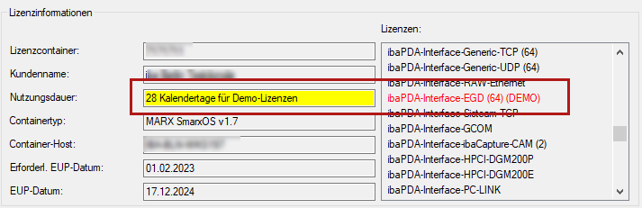 Funktionen, die mit einer Demo-Lizenz freigeschaltet sind, sind bei den Lizenzoptionen im I/O-Manager, Register Allgemein, Knoten Einstellungen, farbig und mit dem Zusatz "(DEMO)" gekennzeichnet. Das Feld Nutzungsdauer zeigt die noch verbleibende Zeit für (alle) Demo-Lizenzen an. Die folgende Abbildung zeigt als Beispiel eine Demo-Lizenz für die Schnittstelle ibaPDA-Interface-EGD.