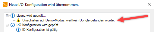 Der Wechsel in den Demo-Modus wird bei der Konfigurationsprüfung angezeigt.