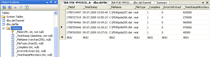 Diese Spalte zeigt den Status des Extraktionsprozesses an. Der erste Datensatz einer Dateiextraktion wird immer mit dem Status "_Complete = 0" in die Dateitabelle ("deFile") eingefügt. Nach Abschluss aller weiteren Einfügungen in die Messkanaltabellen und Segmenttabellen wird das Flag auf "_Complete = 1" aktualisiert.