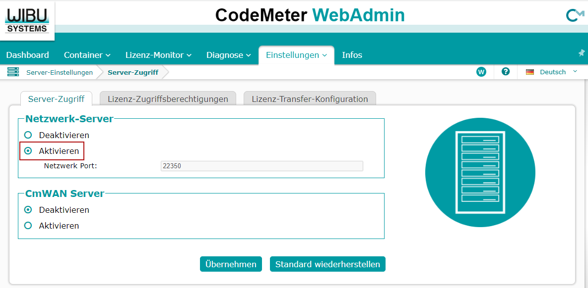 Zur Aktivierung des Netzwerk-Servers öffnen Sie im CodeMeter WebAdmin das Menü Einstellungen – Server – Server-Zugriff.