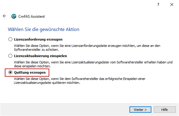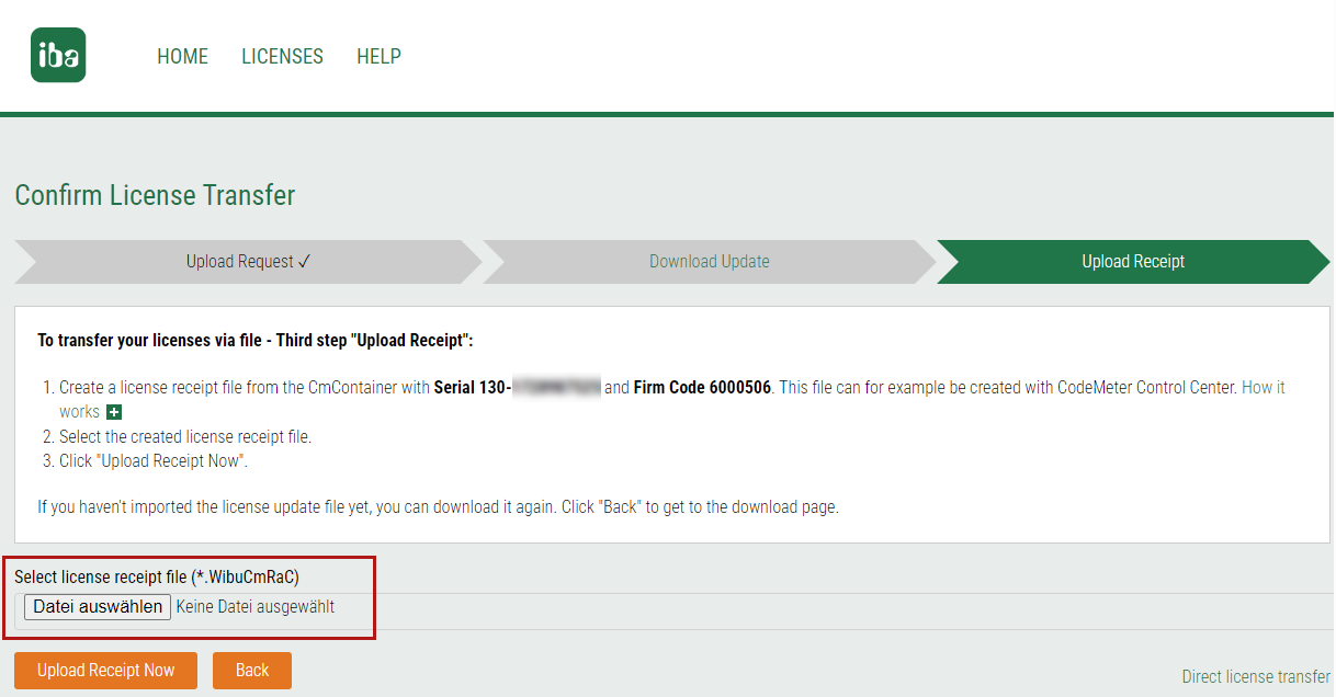 Im gezeigten Beispiel gehen Sie auf Select license receipt file (*.WibuCmRaC) und wählen die gespeicherte Quittungsdatei aus.