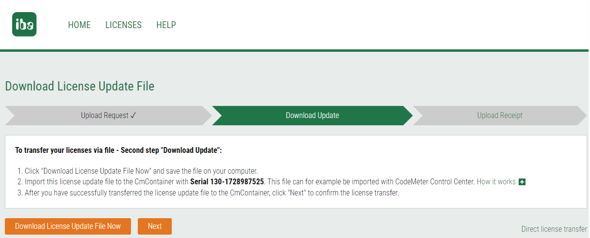 Bei der Online-Lizenzübertragung wird der Prozess zur Quittierung automatisch ausgeführt. Siehe Kapitel Lizenzen direkt übertragen. Das manuelle Hochladen der Quittungsdatei ist nur erforderlich, wenn eine Aktualisierungsdatei (*.WibuCmRaU) über das CodeMeter Kontrollzentrum eingespielt wurde (siehe Kapitel Lizenzaktualisierung einspielen). |
