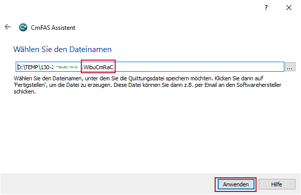 Die Quittungsdatei hat wieder die Endung *.WibuCmRaC. Eine zuvor erzeugte Lizenzanforderungsdatei können Sie überschreiben. Siehe Lizenzanforderungsdatei erzeugen.