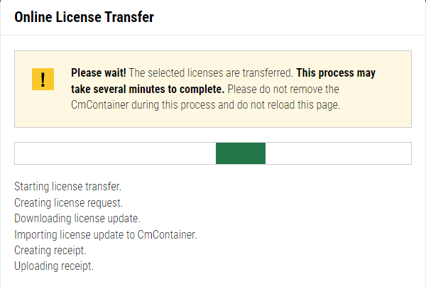 Die Lizenzen werden vom Ticket "ausgebucht" und dem Lizenzcontainer "hinzugebucht". Der Verlauf wird in einem Statusfenster dargestellt. Dieser Vorgang kann einige Minuten dauern.