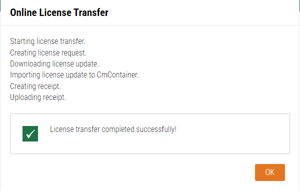 Wenn die Übertragung abgeschlossen ist, wird die erfolgreiche Übertragung der Lizenzen bestätigt.