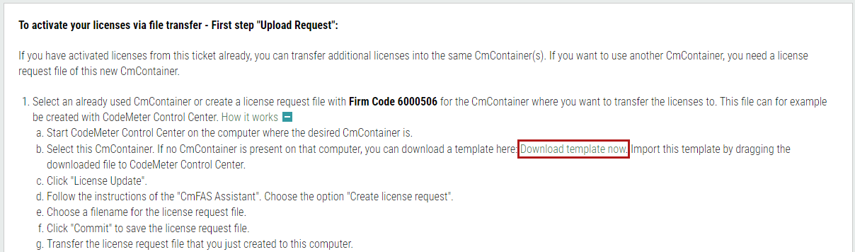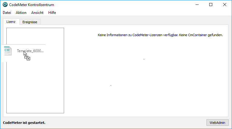 Ziehen Sie nun die heruntergeladenen Lizenzvorlage (Template_*.WibuCmLIF) in das Fenster des CodeMeter Control Center.