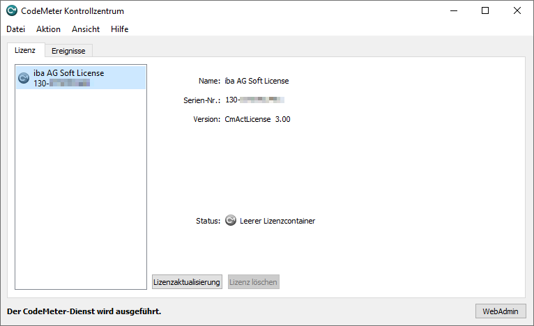 Ein neuer Container mit einer Seriennummer (beginnend mit 130-xxx) wird erstellt. Dieser Container ist nun auch an die Hardware-Eigenschaften des PCs gebunden und kann genauso verwendet werden wie ein USB-Dongle, der an den PC angeschlossen ist. Allerdings enthält er zu diesem Zeitpunkt noch keine Lizenzen.