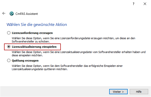 Wählen Sie nun "Lizenzaktualisierung einspielen" und klicken Sie auf <Weiter>.