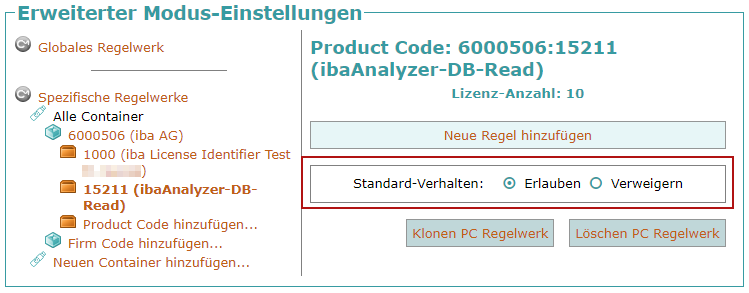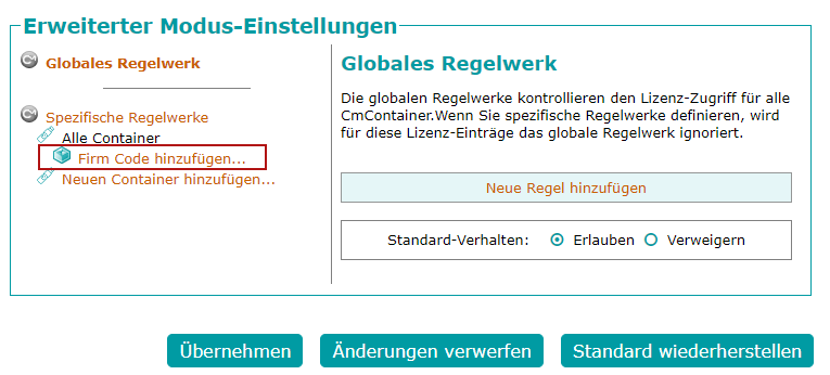 Um die Zugriffsberechtigungen für eine Lizenz zu bestimmen, setzen Sie zuerst das jeweilige Standard-Verhalten auf "Erlauben" oder "Verweigern".