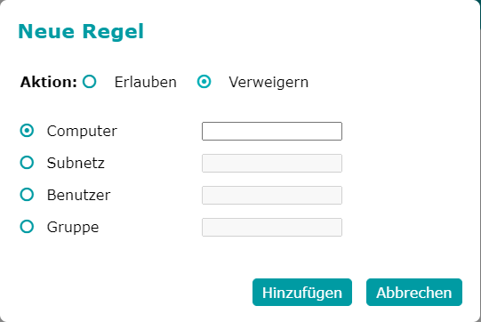 Klicken Sie hierzu auf "Neue Regel hinzufügen" und aktivieren Sie im nachfolgenden Dialogfeld als Aktion "Verweigern", um anhand der Regeln den Zugriff für einen Client eindeutig zu entziehen.
