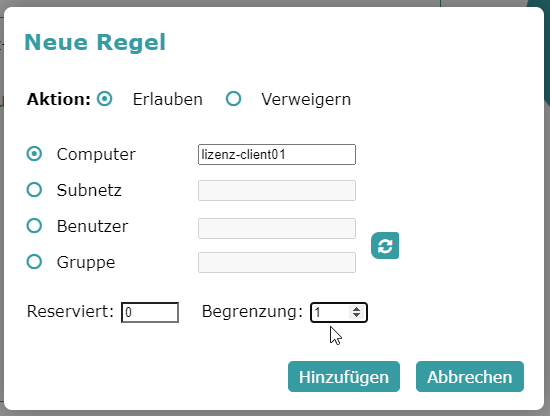 Eine Anzahl von Lizenzen, die für den Computer/das Subnetz/den Benutzer/die Gruppe reserviert werden soll, damit die Lizenz nicht von anderen Clients belegt werden kann.