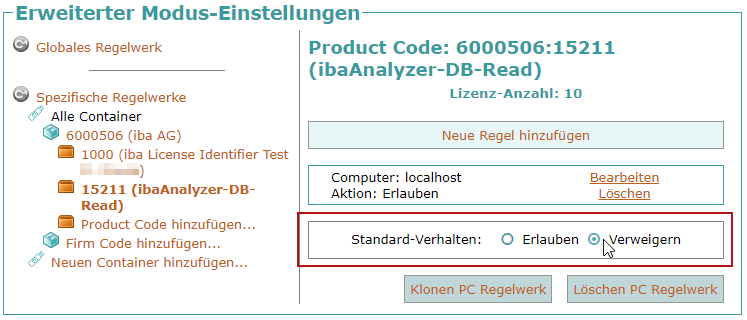Wenn Sie als Standard-Verhalten die Option "Verweigern" wählen, kann zunächst kein Client auf diese Produktlizenz zugreifen und die Zugriffsberechtigungen werden erst im weiteren Verlauf gezielt festgelegt.