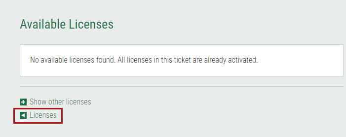 Wenn die Meldung "Es wurden keine verfügbaren Lizenzen gefunden.Alle Lizenzen in diesem Ticket sind bereis aktiviert" angezeigt wird, klicken Sie auf <Licenses> (Meine Lizenzen), um mit der Übertragung fortzufahren.
