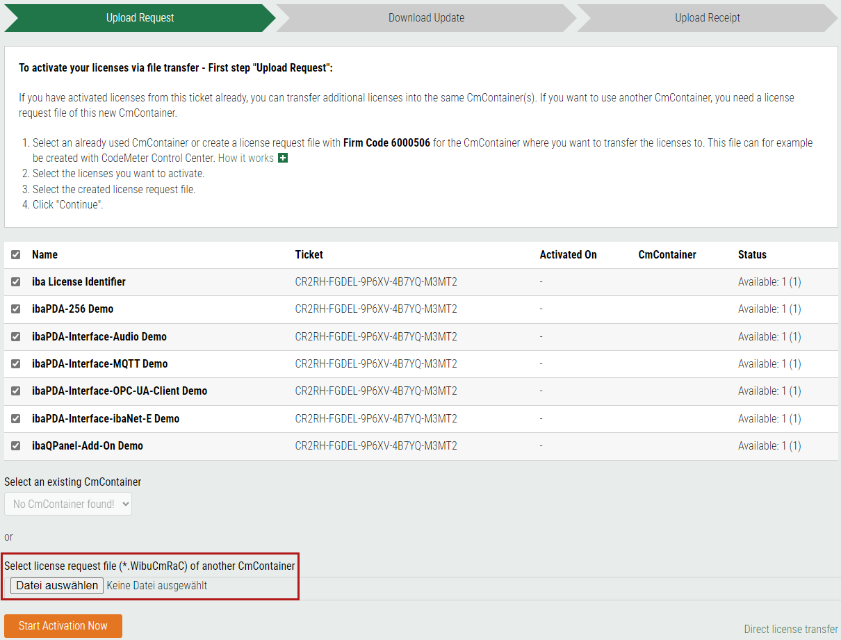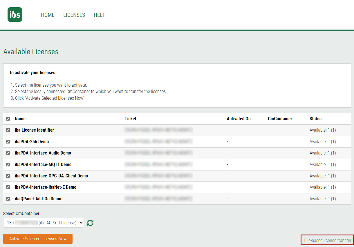 Häufig wird die Ticketnummer bei der Lieferung von iba direkt in den Link zum WebDepot integriert. In diesem Fall sehen Sie gleich nach Aufruf des Links eine Übersicht der verfügbaren Lizenzen.