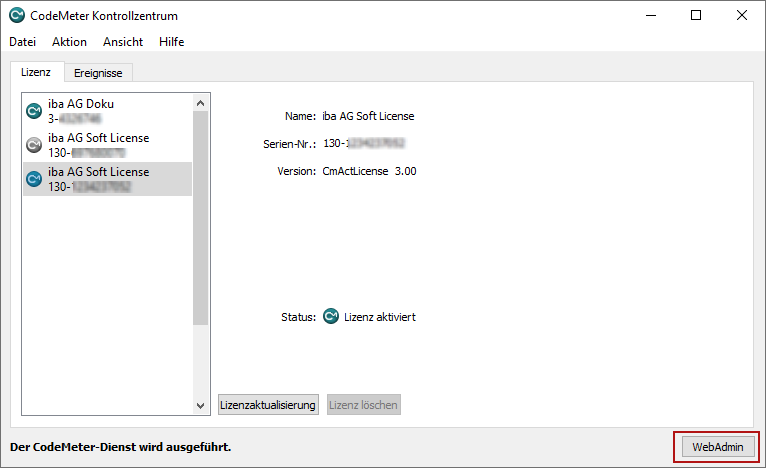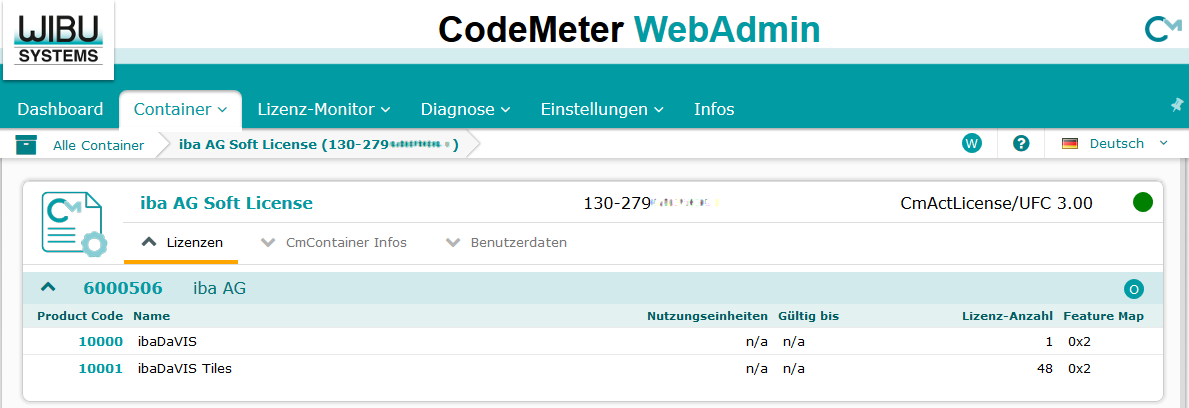 Um den Inhalt eines Lizenzcontainers anzuzeigen, markieren Sie den Container im Register Lizenz und klicken Sie auf den Button <WebAdmin>.