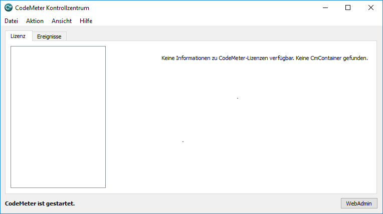 Wenn keine Lizenzcontainer verfügbar sind, ist das Register Lizenz leer und ein entsprechender Hinweis wird eingeblendet.