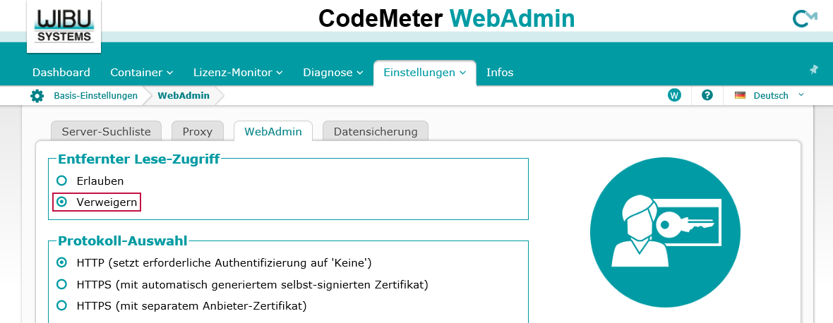 Standardmäßig ist für das CodeMeter WebAdmin der entfernte Lese-Zugriff im lokalen Netzwerk erlaubt. Falls dies nicht erwünscht ist, nehmen Sie die entsprechende Einstellung für jeden Rechner individuell vor: