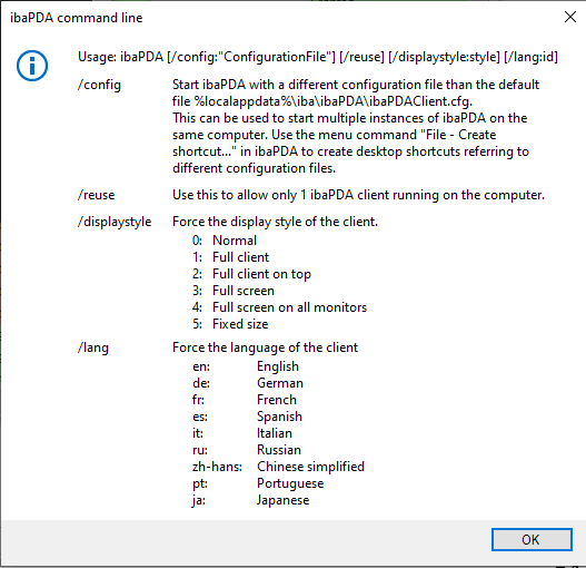 ibaPDA.exe [/config:“ConfigurationFile“][/reuse][/displaystyle:style][/lang:id]