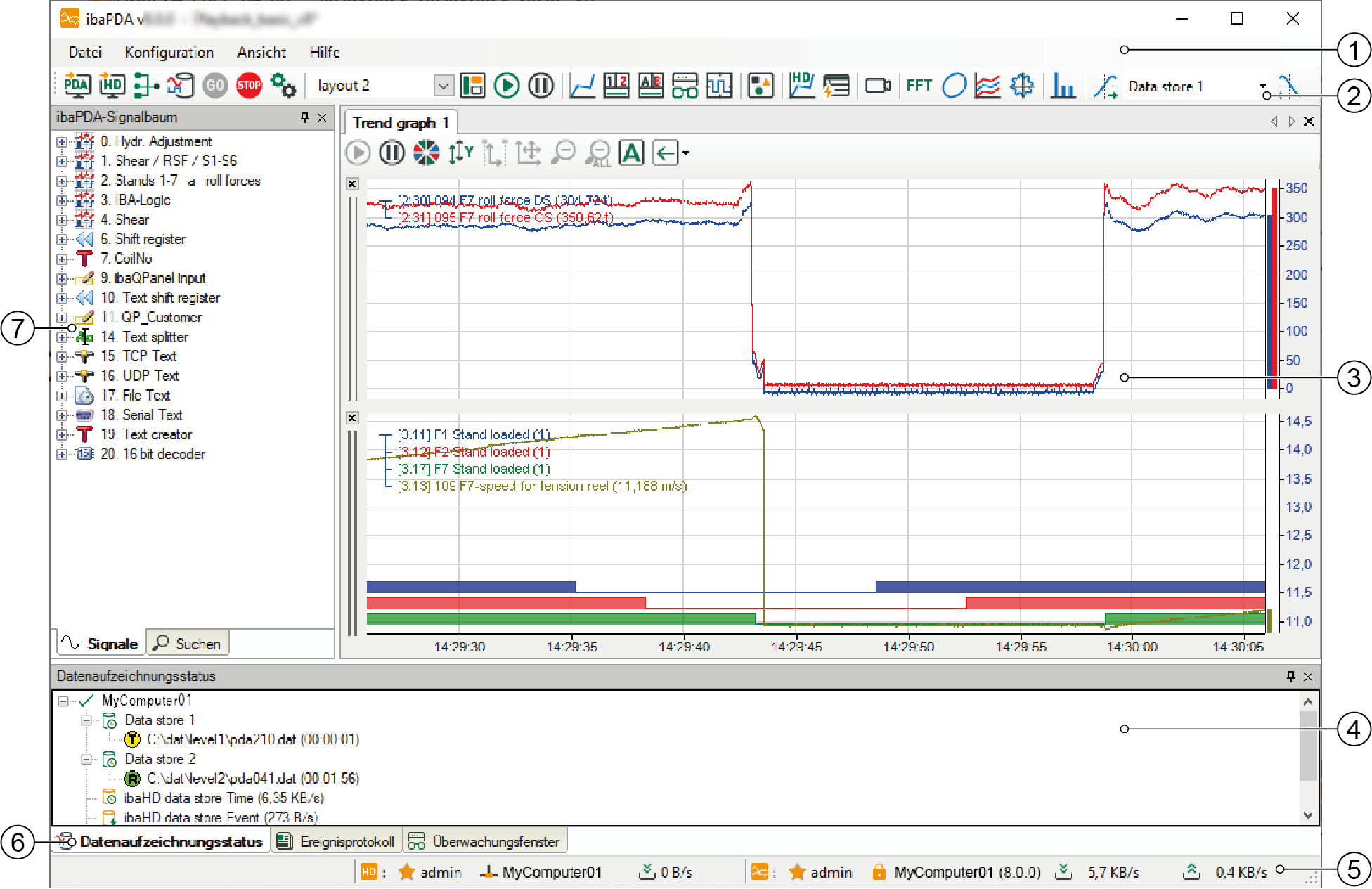 Nachfolgend ist eine Übersicht über die standardmäßige ibaPDA-Hauptanzeige.