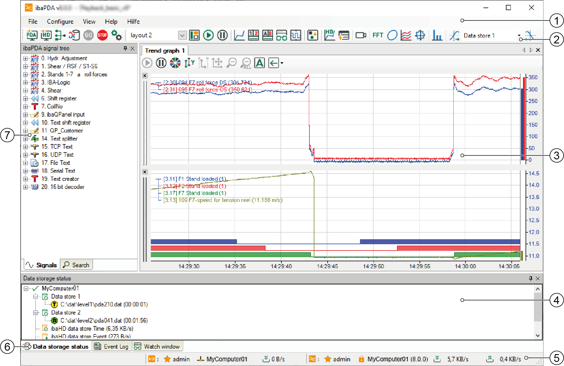 The different areas of the ibaPDA screen are presented as an example in the following image.
