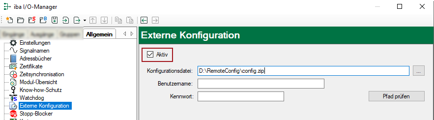 Öffnen Sie den I/O-Manager und wählen Sie das Register Allgemein und dort den Knoten Externe Konfiguration.