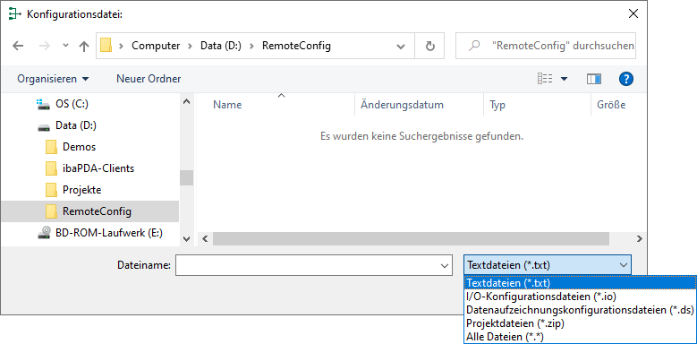 Geben Sie den vollständigen Pfad und Namen der Konfigurationsdatei an, die Sie verwenden möchten. Name und Erweiterung der Datei, die Sie später in dieses Verzeichnis kopieren, muss exakt mit dem hier angegebenen Namen übereinstimmen. Es ist sinnvoll einen Dateinamen zu wählen, der bei jeder Änderung der Konfiguration wieder vergeben wird, wie z. B. "config". Somit wäre es nicht jedes Mal erforderlich den Dateinamen im I/O-Manager zu ändern. Auf der anderen Seite bliebe der Konfigurationsname in der Kopfzeile des ibaPDA-Client-Fensters immer gleich.