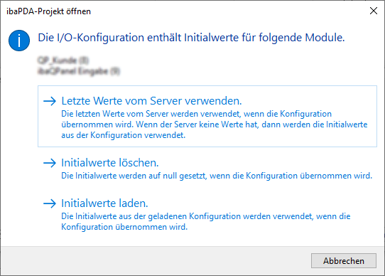 Wenn in der I/O-Konfiguration des zu öffnenden Projekts remanente Module oder Module mit Initialwerten enthalten sind (z. B. ibaQPanel Eingabe, ibaQPanel Texteingabe, Schieberegister, Virtuell remanent usw.), dann erfolgt eine Abfrage, ob die Initialwerte gelöscht oder geladen werden sollen oder ob die letzten Werte vom Server übernommen werden sollen.