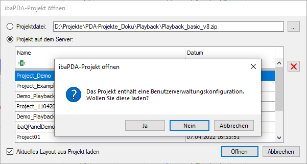 Wenn die Option Aktuelles Layout aus Projekt laden aktiviert ist und das Projekt ein gespeichertes Layout enthält, so wird das Layout vom Server zum Client übertragen und der Client wird das Layout laden. Wenn beim Speichern des Projekts eine Benutzerverwaltungskonfiguration mit gespeichert wurde, dann erfolgt beim Öffnen zusätzlich eine Abfrage, ob die Benutzerverwaltung auch geladen werden soll.