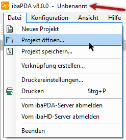 Standardmäßig trägt das Projekt den Titel "Unbenannt" oder "Untitled", wie im Bild oben zu sehen. Über das Dateimenü können Sie das Projekt öffnen oder speichern. Sobald Sie die I/O-Konfiguration oder die Konfiguration der Datenaufzeichnung abgeschlossen haben (wie an späterer Stelle beschrieben), können Sie sie in einem ibaPDA-Projekt abspeichern.