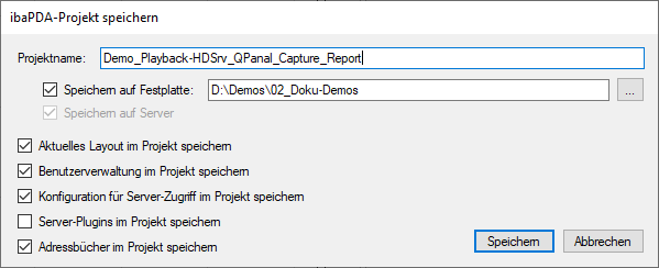 gespeichert (Standard: C:\ProgramData\iba\ibaPDA\Projekte). Wenn Sie das Projekt zusätzlich als Datei auf der Festplatte oder einem anderen