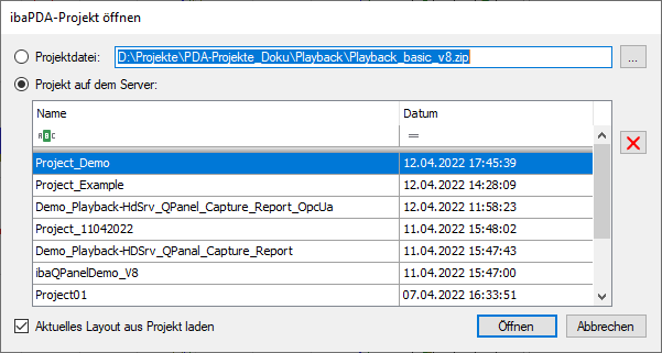 Die Tabelle zeigt die auf dem Server verfügbaren Projekte an. Wenn Sie ein Projekt vom Server öffnen, markieren Sie das Projekt in der Tabelle und wählen Sie <Öffnen>.