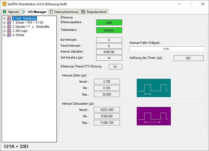 Die Werte für die Zeiten werden nur angezeigt, wenn die Erfassung läuft. Das System misst dabei die tatsächliche Zykluszeit des Interrupts und hält die kürzeste Dauer (Min.) und die längste Dauer (Max.) fest.