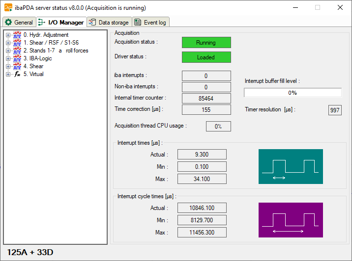These values are only displayed when the acquisition is running. The system measures the actual cycle time of the interrupt and stores the shortest (Min) and longest (Max) time.