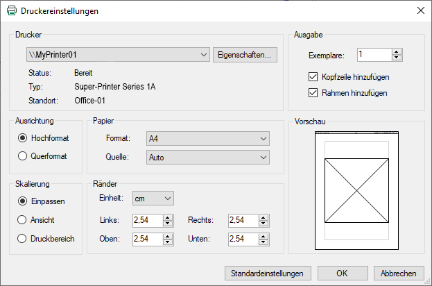 Zeigt eine schematische Druckvorschau. Ist der Skalierungsmodus Einpassen gewählt, so wird das Seitenverhältnis der Ansicht als quadratisch angesehen.