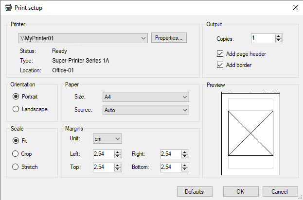 The ibaPDA print setup dialog can be accessed in the File– Print settings… menu. The dialog also opens when printing a single view via the context menu of the View tab.