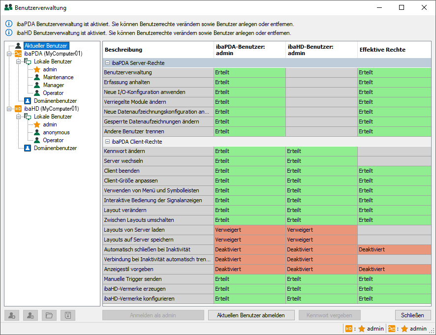 Wenn ibaPDA-Client mit einem ibaPDA- und einem ibaHD-Server verbunden ist, werden die Rechte für beide Server angezeigt. Die Benutzer, mit denen ibaPDA-Client jeweils angemeldet ist, können unterschiedlich sein.