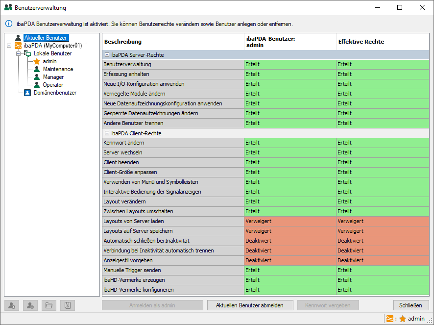 Für ibaPDA können in der Benutzerverwaltung den Benutzern Rechte bzgl. ibaPDA-Client und ibaPDA-Server erteilt werden.