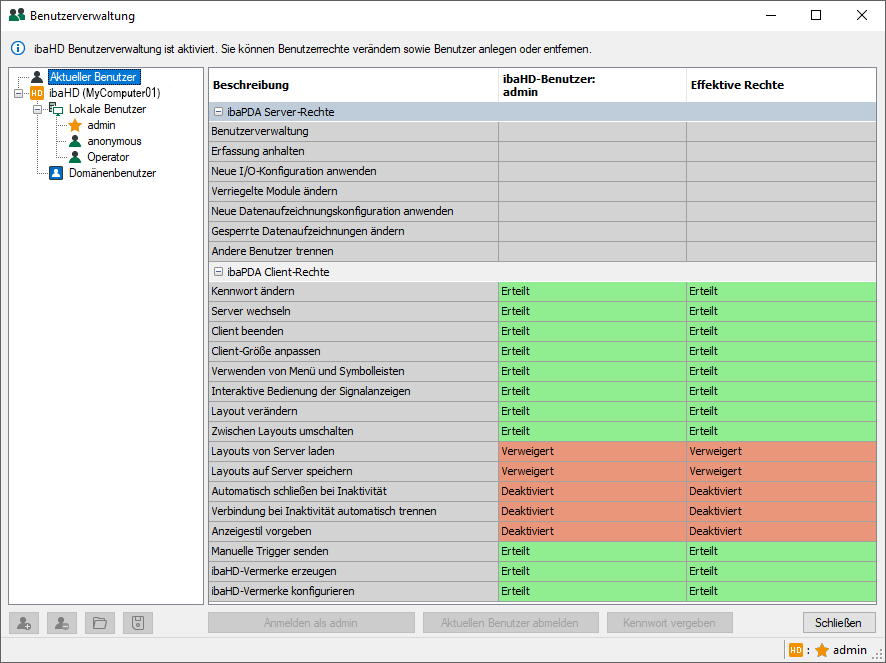 Da das Programm ibaPDA-Client sowohl für ibaPDA als auch für ibaHD-Server verwendet wird, ist die Benutzerverwaltung für beide Programme im Dialog Benutzerverwaltung von ibaPDA-Client möglich. Unterschiede bestehen bei den programmspezifischen Berechtigungen.