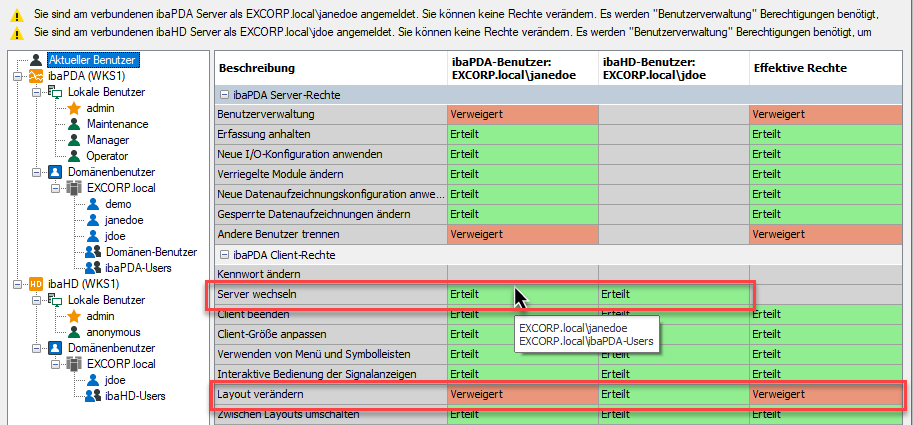 Eine gleichzeitige Anmeldung an ibaPDA- und ibaHD-Server mit unterschiedlichen Benutzern ist möglich, aber nicht unbedingt sinnvoll. Insbesondere in dem Fall, dass sowohl einem ibaPDA-Benutzer als auch einem ibaHD-Server-Benutzer die gleichen Rechte zur Verfügung stehen, werden vom System durch Kombination effektive Rechte ermittelt. |