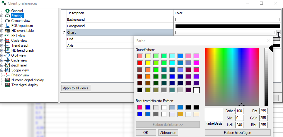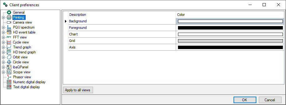 In order to make a general color setting, select the "Printing" main branch in the tree. Click in a cell in the color column and select the desired color. If you want the new settings to be applied to all types of views, click on the <Apply to all views> button.