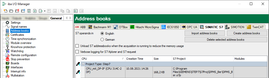 Below is a table listing all of the address books available on the system, with reference to the PLC, the creation date and – if available – the project. The last column lists the modules that have been configured for the specific CPU.