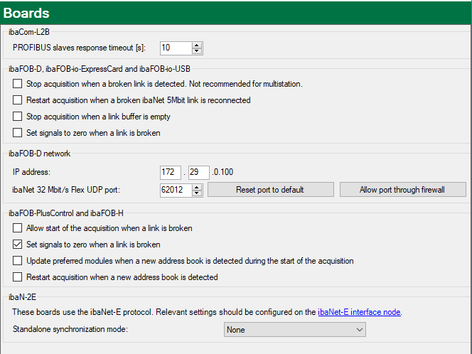 Several optional settings regarding iba PC boards can be made at this stage, for example, in order to determine the system’s behavior in case of communication errors. Referring to the following boards