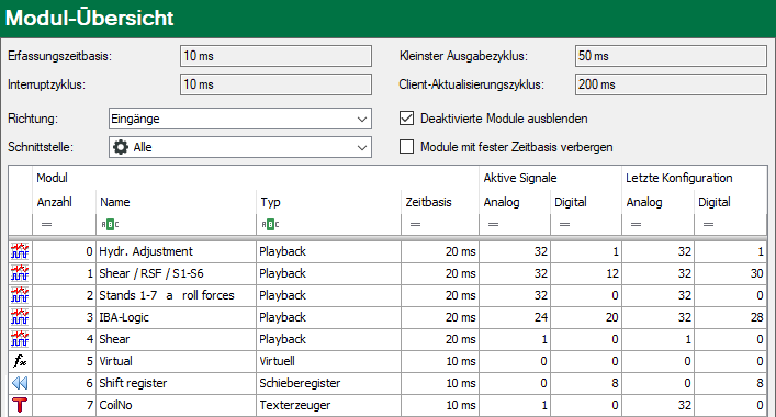 In der Spalte Aktive Signale sehen Sie, wie viele analoge und digitale Signale des jeweiligen Moduls aktiv sind.
