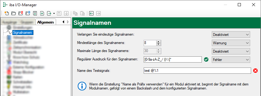 Der Signalname muss einem regulären Ausdruck entsprechenDer Signalname darf nur die Zeichen enthalten, die gem. dem regulären Ausdruck zulässig sind. (Default: