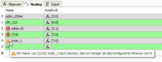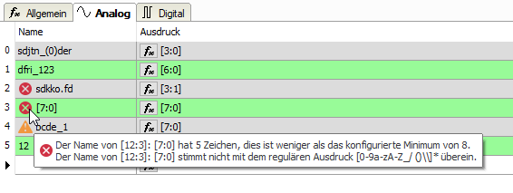 Die Einhaltung der aktiven Regeln wird bereits bei der Arbeit im I/O-Manager überwacht. Wenn ein Signalname nicht mit den Regeln übereinstimmt, wird dies in der Signaltabelle mit einem Fehler- oder Warnsymbol signalisiert. Die folgenden Beispiele beziehen sich auf die Einstellungen in der Abbildung oben.