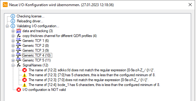 Außerdem wird die Einhaltung der Regeln bei der Validierung der I/O-Konfiguration, z. B. beim Start der Erfassung geprüft. Entsprechende Warn- oder Fehlermeldungen werden angezeigt und bei Auftreten von Fehlern wird die I/O-Konfiguration als ungültig klassifiziert.