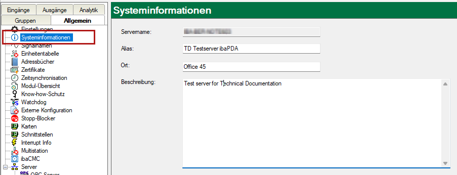 Der Knoten Systeminformationen enthält Informationen zum ibaPDA-Serverrechner. Die Anzeige des Servernamens erfolgt automatisch auf Basis des Rechnernamens unter Windows.