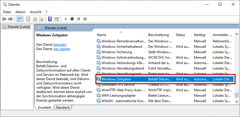 Um Konflikte zwischen der Windows Zeitführung und der ibaPDA Zeitsynchronisation zu vermeiden, sollten Sie den lokalen Dienst Windows Zeitgeber auf dem Rechner deaktivieren, sobald Sie eine der ibaPDA-Methoden zur Zeitsynchronisation gewählt haben.