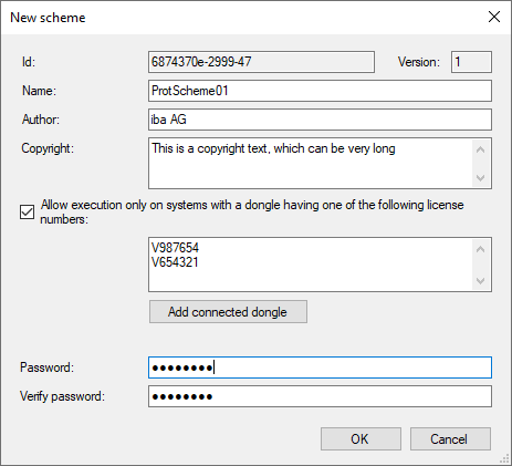 Enable this option if the elements protected by this scheme are only to be executed on systems with certain license numbers (license protection). Then enter all respective license numbers in the field below. You can easily enter the number of the respective connected dongle or active soft license using the <Add connected dongle> button. If you do not enable this option, there is no execution restriction of the protected elements with respect to the license number.