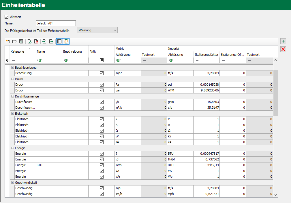 Die Tabelle enthält Einheitensysteme und Einheiten. Von den Einheitensystemen ist eines das primäre System (Standardtabelle: metrisch). Bei dem oder den anderen Einheitensystemen gibt es zusätzliche Spalten mit Skalierungsfaktor und –offset, in denen die Werte für die Umrechnung stehen. Optional können Sie Testwertspalten öffnen, um die Umrechnung mit Beispielwerten zu überprüfen.